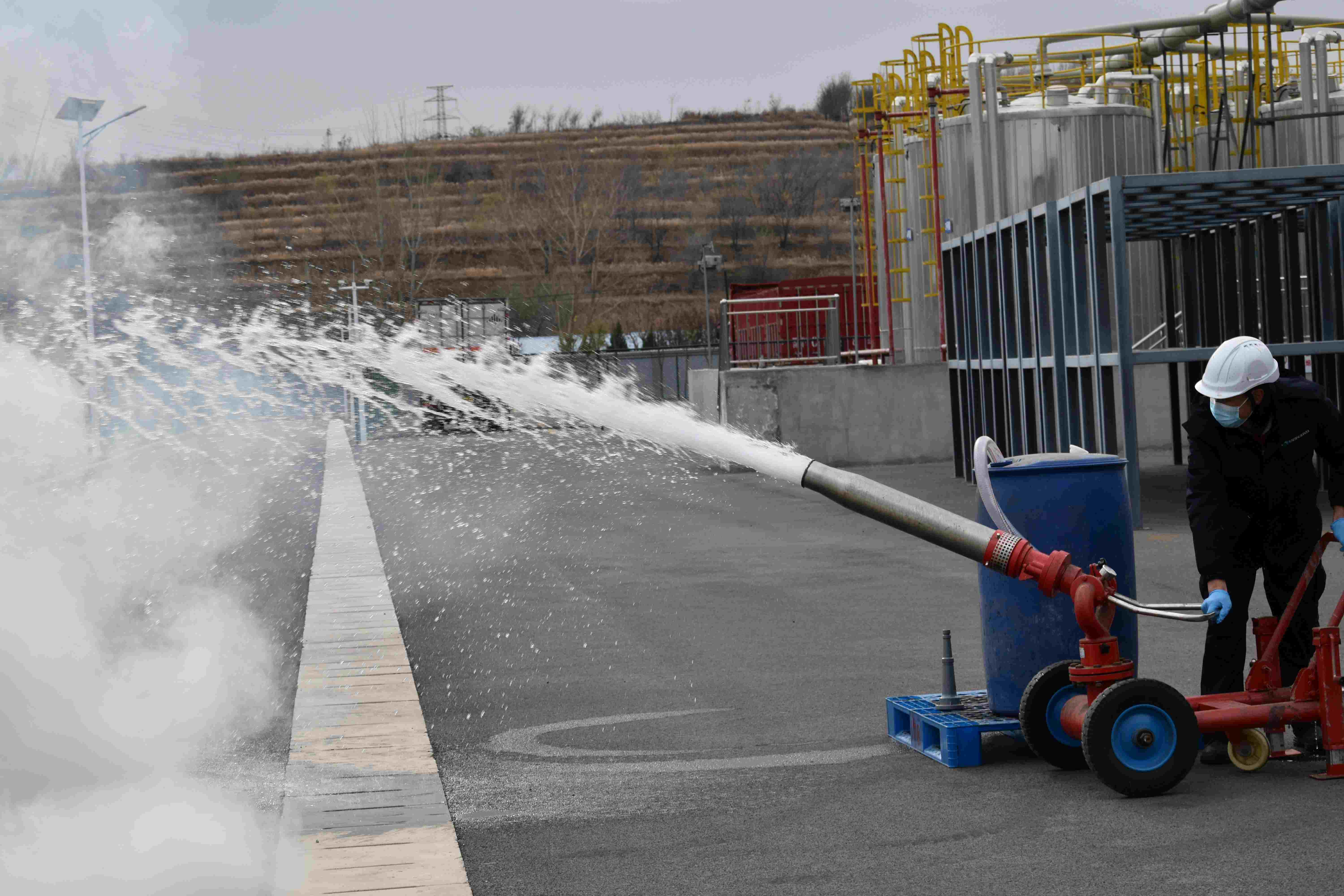 消防演練正式開始,薛副總宣布啟動(dòng)“環(huán)保消防應(yīng)急預(yù)案演習(xí)”,接到丙類罐區(qū)火情報(bào)警信息后,李經(jīng)理立即啟動(dòng)應(yīng)急預(yù)案,各小組按應(yīng)急預(yù)案快速投入滅火、救治等工作中。通訊與警戒組現(xiàn)場(chǎng)進(jìn)行調(diào)度、警戒,并對(duì)火災(zāi)現(xiàn)場(chǎng)進(jìn)行封鎖。醫(yī)療救護(hù)組對(duì)傷員進(jìn)行轉(zhuǎn)移、臨時(shí)急救。搶險(xiǎn)搶修組身著滅火服對(duì)著火點(diǎn)實(shí)施滅火。